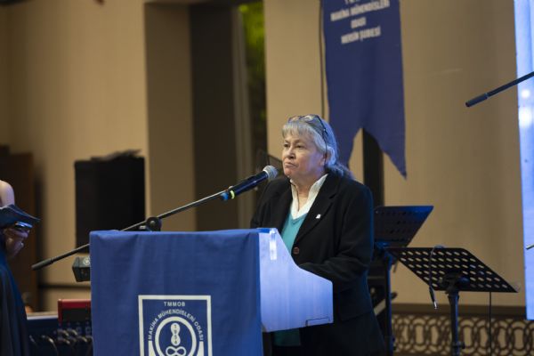 MMO Yönetim Kurulu Sekreteri Elif Öztürk, ülkedeki sorunların meslek gruplarına etki ettiğini ve bu sorunlar için mücadele verdiklerini ifade ederek, “Hiç tartışmasız ülke olarak zor günlerden geçiyoruz. Biz mühendisler olarak sorunların üstünü örtmeyiz, meslek grubu olarak bu sorunlardan nasibimizi alıyoruz. İnatla ve umutla hep birlikte bu ülkeyi daha güzel günlere götüreceğiz. Bunun için hep birlikte mücadele edeceğiz, çünkü mühendisler eğitimleri gereği sadece şikayet etmezler çözüm üretirler ve her şeyin daha iyi çalışması için uğraşırlar. Bugün, mesleğe uzun yıllarını vermiş üyeler plaketlerini alacaklar ama biz her zaman yanlarımızda olmasını temenni ediyoruz” şeklinde konuştu.