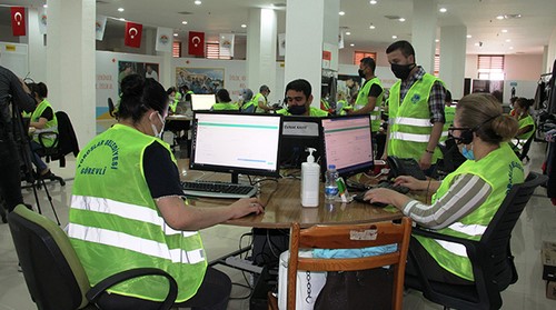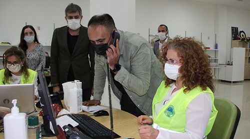 Bugün de merkezi ziyaret eden Yılmaz, birim masalarını tek tek gezerek ekiplerden bilgi aldı. Yılmaz, telefonun başına oturarak, vatandaşlardan gelen taleplere de yanıt verdi.