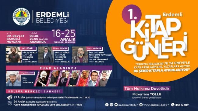 Kitap fuarına herkesin gelmesi gerektiğini İfade eden Enes Kara, “ Mükerrem Tollu başkanımız sağ olsun kitap fuarı açmış. Çıkın çıkın gelin” diye konuştu. Diğer yandan “1. Erdemli Kitap Günleri” 26 Aralık akşam saat 20.00’a kadar devam edecek.