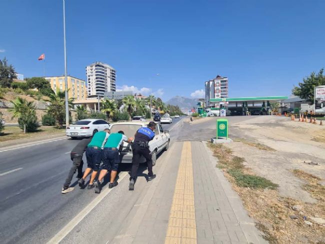 Mersin’de yakıtı biten otomobil yol ortasında kaldı. Vatandaşlar ve bir polis, aracı iterek akaryakıt istasyonuna ulaştırdı. O anlar ise bir vatandaş tara...